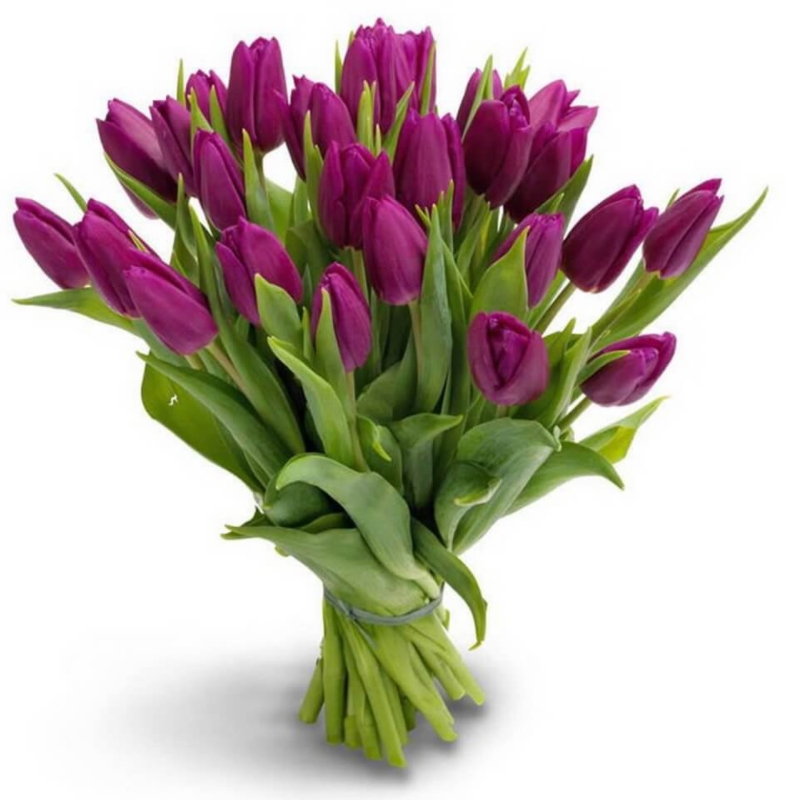 Букет состоит из 21 сиреневый тюльпан, прозрачная упаковка, атласная лента.