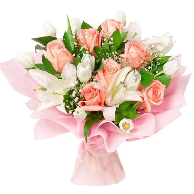 Букет состоит из 7 розовых роз, 2 белых лилии, 11 тюльпанов, 3 гипсофила, зелень, красивая упаковка, атласная лента.