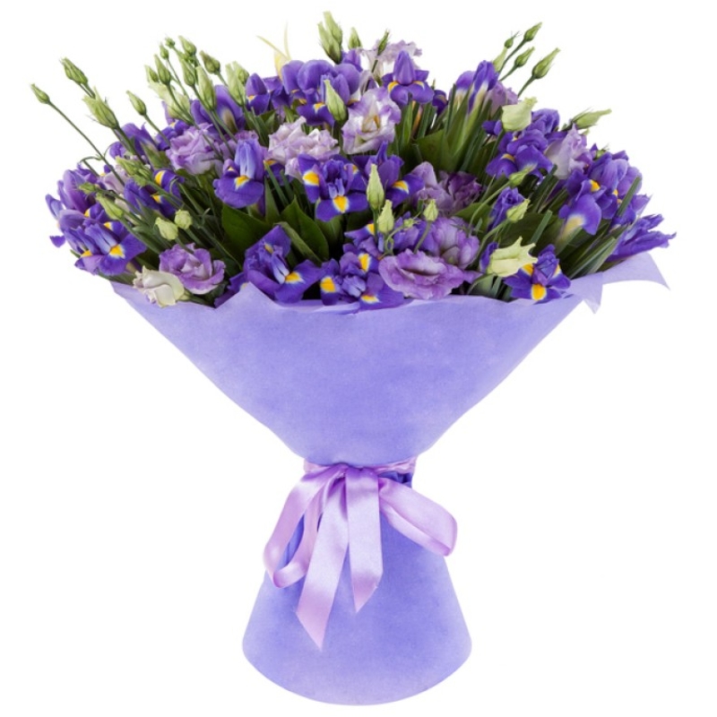 Букет состоит из 15 веток эустомы, 35 ирисов, зелень, красивая упаковка, атласная лента.