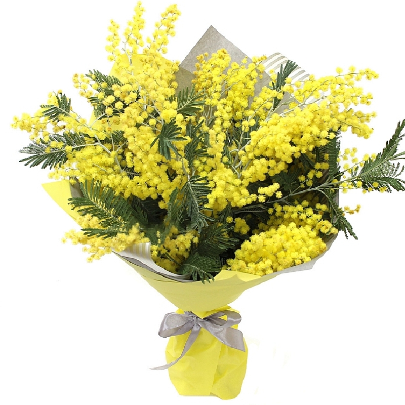 Букет состоит из 7 веток мимозы, крафт, атласная лента.