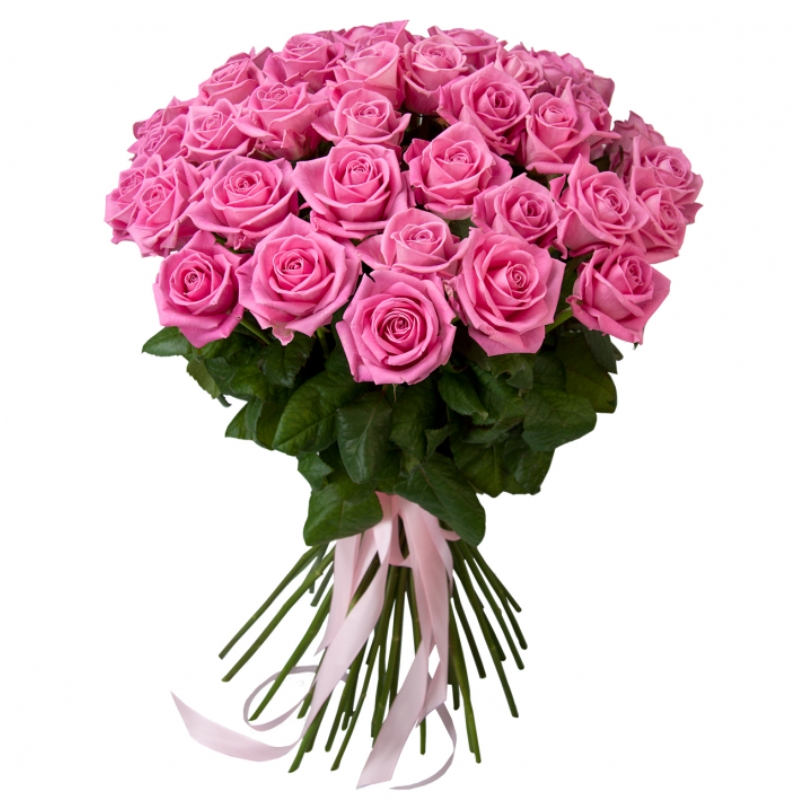 Букет состоит из 55 розовых роз, прозрачная упаковка, атласная лента.
